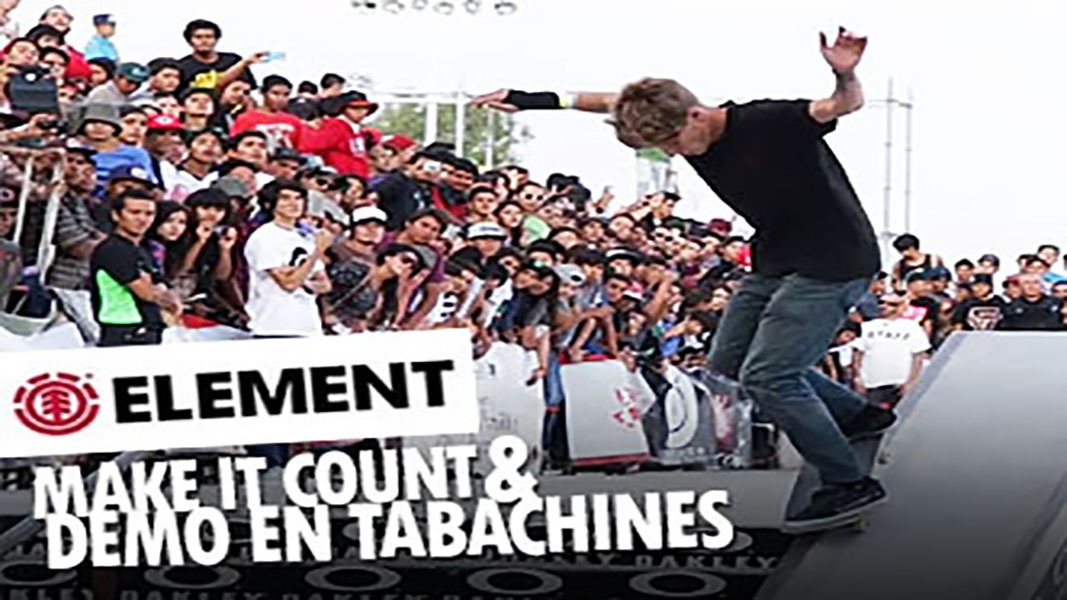 El pasado sábado 26 de abril se realizó en el parque de Tabachines el Make It Count donde Ownen Navarro resulto ganador así como una demo por parte del equipo Element con Nyjah Huston, Julian Davidson, Nick Garcia, Dominick Walker y el mexicano Jorge Farah "Pekas"